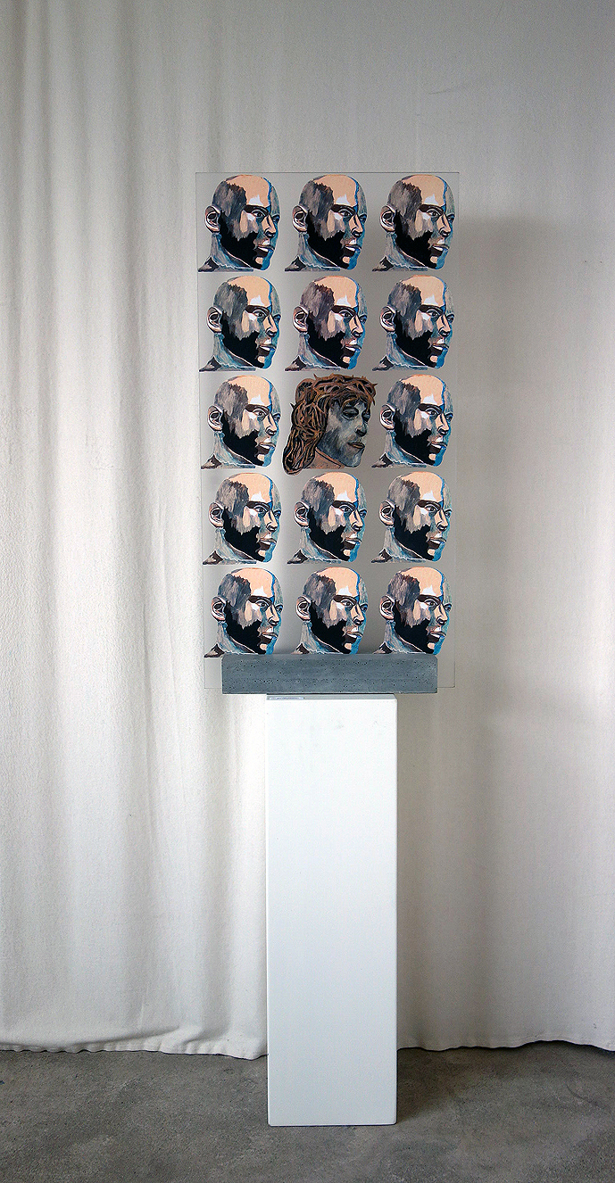 Die vorliegende Arbeit zeigt fünfzehn Profilbilder, davon vierzehn als identische Wesen. Die computeranimierten und von mir malerisch bearbeiteten Profile sind dem Betrachter nicht zugewandt, schauen aber alle in die gleiche Richtung, stehen damit quasi „in Reih und Glied“. Die Art der Darstellung möchte als Metapher für den sogenannten Massenmenschen aufgefasst werden. Das vermasste Individuum passt sich dem Mainstream an, kommt in keine Konflikte, da es nicht aneckt und häufig gleichgültig den gesellschaftlichen Entwicklungen gegenübersteht. Nur derjenige, der anders ist, trägt einen Dornenkranz. Es kostet Mut und Kraft und auch die Bereitschaft Leid zu tragen, gegen den Strom zu schwimmen, sich gegen ein Regime zu stellen, seine Werte zu vertreten, sei es in Gesellschaft, Religion oder Politik. Dafür gibt es zahlreiche Beispiele, angefangen von Jesus Christus bis hin zum Kremlkritiker Alexej Nawalny.
