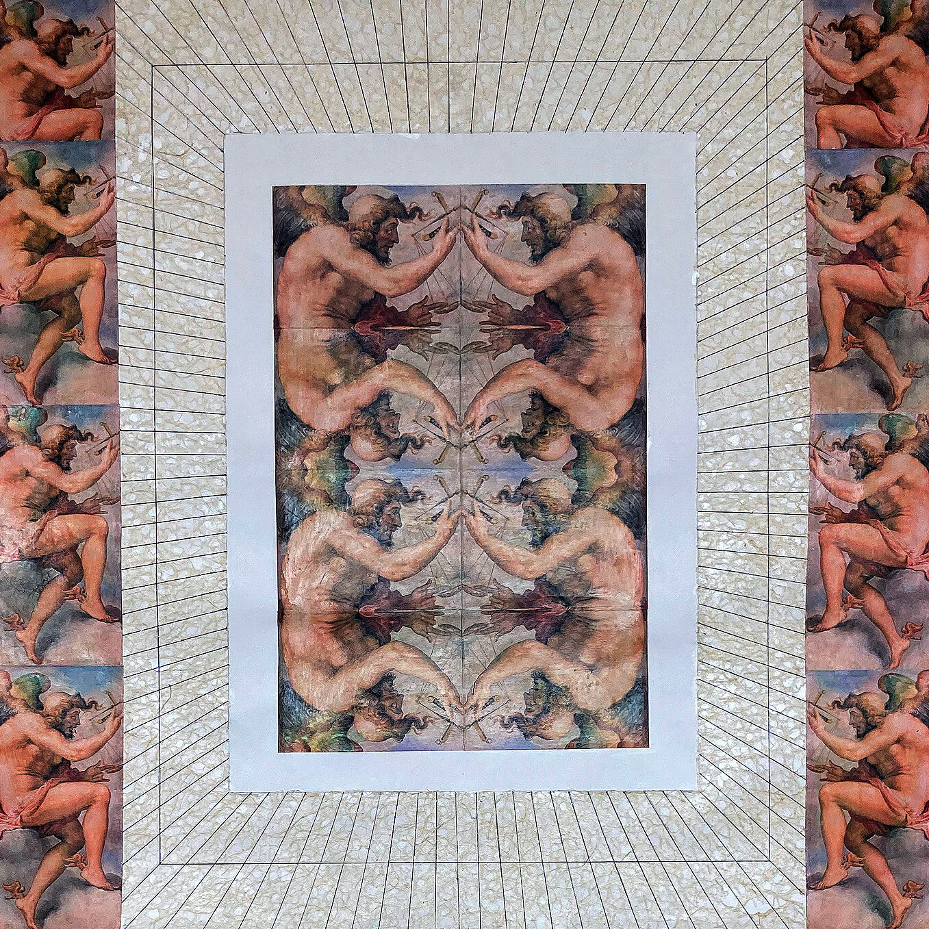 Diese zentralen Fotografien basieren auf der berühmten Kairos-Darstellung von Francesco Salvati (1543–1545), dem Fresco „Il Tempo Opportuno“ im Palazzo Vecchio in Florenz. Durch Spiegelung, Drehung und Neuordnung treten Bildmotive in Dialog, formen neue, charakteristische Konstellationen und Bildgestalten. Aus dem Zusammenspiel entsteht etwas Eigenständiges, ein neuer Ausdruck, eine neue Bildsprache.