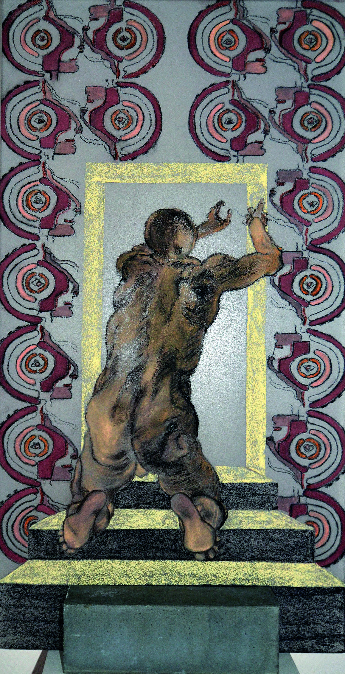 Die Arbeit zeigt einen entblößten Menschen, der kniend vor einem Türrahmen um Einlass bittet. Der menschlichen Gestalt liegt eine Skizze von Michelangelo zugrunde. Seine Zeit, die Renaissance, war geprägt durch ein geistiges Erwachen, die den Menschen in seiner Schönheit, seiner Freiheit und in seiner Würde nach dem Vorbild der Antike neu entdeckte.